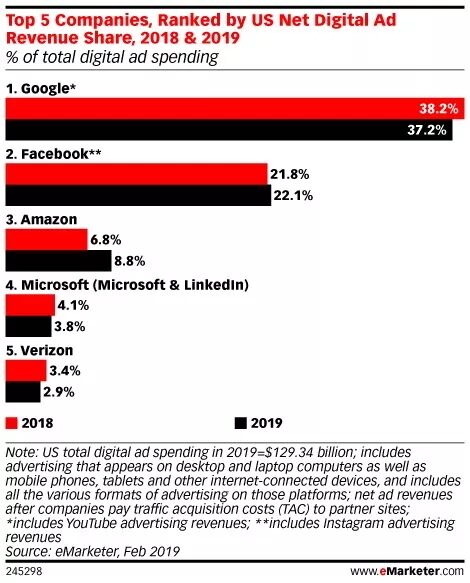 2014年,Google和Facebook两巨头首次在美国数字广告市场占比50%以上,半分江山的格局正式形成。