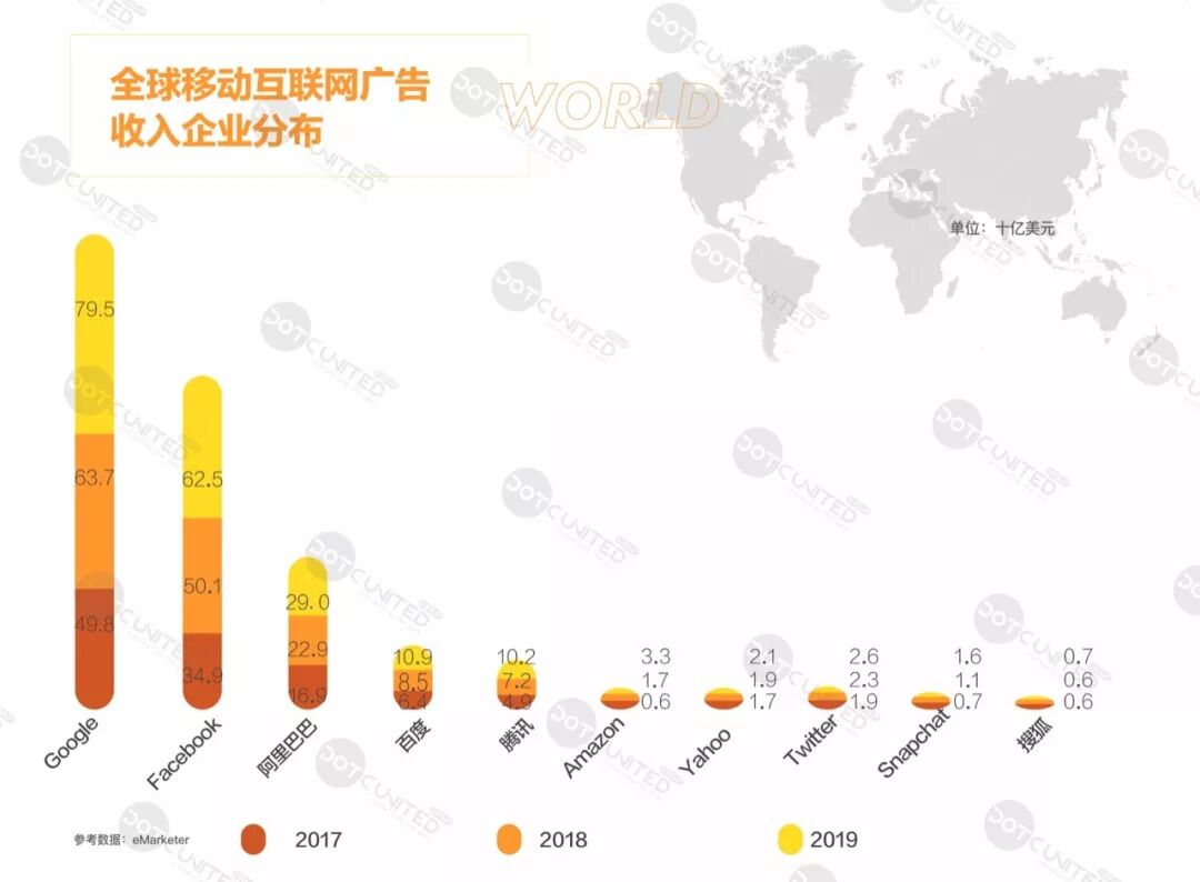 2018 年 ,据 eMarketer 数据统计Google、Facebook 继续领导全球数字广告公司,中国 BAT 公司紧随其后。