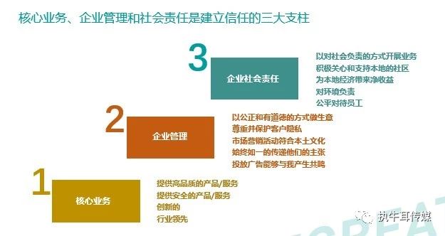 在当下,中国企业在海外市场上建立信任,首先要强调产品质量、产品安全性、产品创新;其次,要重视商业道德、营销活动、尊重本土文化以及与消费者能否产生共鸣,并且注重保护消费者隐私;最后,要以对社会负责任的方式开展业务。