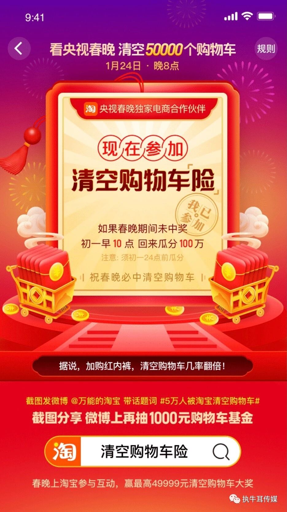 据介绍,消费者春节前就可以通过下载手机淘宝APP参与清空购物车活动,选取会场中的幸运商品提前加入自己的购物车。这些加购的幸运商品在除夕春晚播出时段,伴随春晚主持人口播提醒有机会在抽奖后获得清空资格。