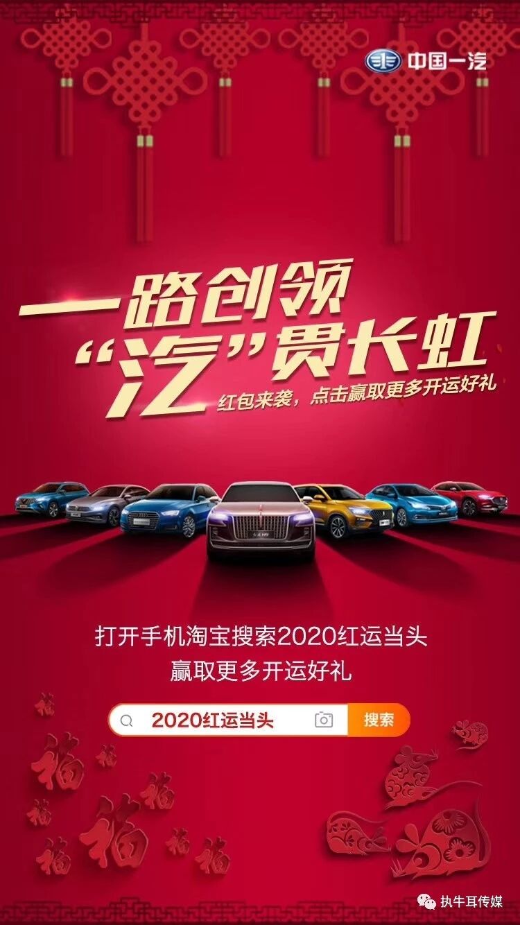 中国一汽将在即将到来的2020春节期间,借助淘宝平台,拉近7亿消费者与中国一汽的距离,加深用户对中国一汽的品牌忠诚度。同时,中国一汽还将通过“淘宝清空购物车”活动,发放购车礼券等营销活动,为旗下各子品牌积蓄优质的消费者资产。