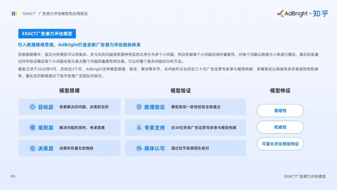 模型立项于2020年7月,历时近半年,由AdBright主持模型搭建、验证、测试等环节,业内标杆企业中的近三十位广告运营专家参与模型构建,多番验证以保障体系的客观性和权威性,量化后的数据还通过了知乎效果广告团队的核对。